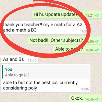 You are highly recommended by my gf whos 2 or 3 of her kids taught under you and they have gotten very good results. So is like words of mouth la...✌️